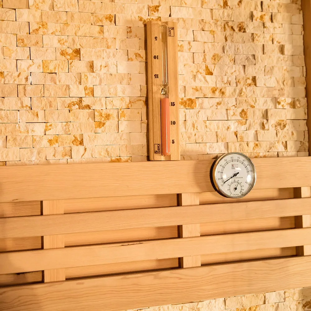 - Датчик температуры: встроен в боковую стенку сауны и точно фиксирует изменения температуры в разных зонах, обеспечивая равномерный нагрев.