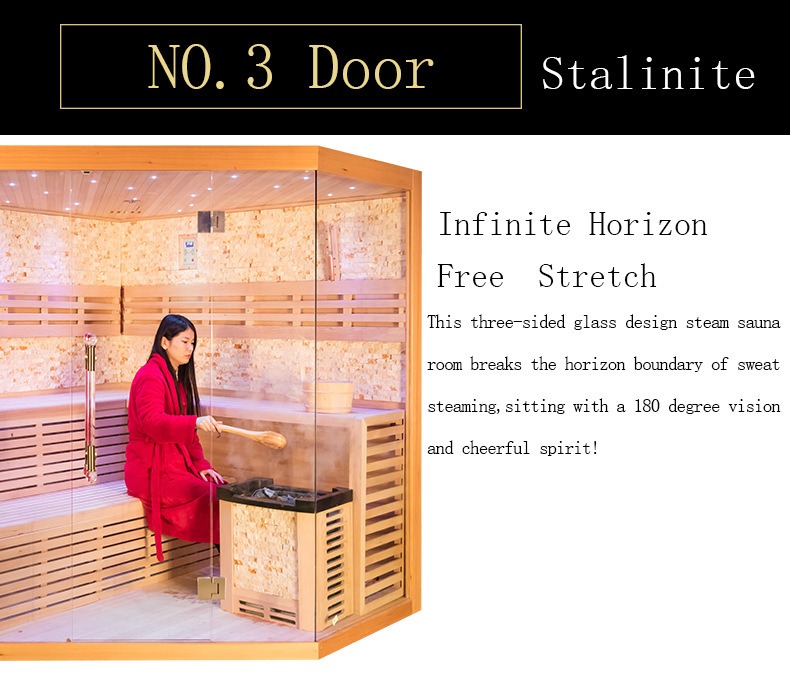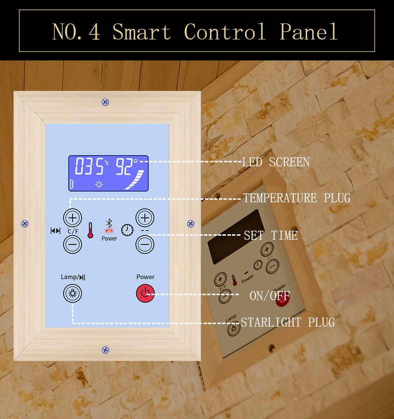Инновационная трехсторонняя конструкция двери из сталинского стекла проходит специальную высокотемпературную закалку, обеспечивая исключительную термостойкость и ударопрочность. Он сохраняет стабильность даже при температуре внутри сауны, превышающей 70 ℃, обладает сверхвысокой прозрачностью и отсутствием оптических искажений. Трехсторонняя стеклянная конструкция обеспечивает беспрепятственный обзор на 180 градусов, полностью разрушая ощущение тесноты и замкнутости традиционных саун. Пользователи могут поддерживать визуальный контакт с внешней средой, наслаждаясь сауной, что делает ее идеальной для домашних балконов, дворов и других мест, позволяя вам наслаждаться пейзажами на открытом воздухе, одновременно проходя тепловую терапию для более расслабленного и комфортного ума и тела. Кроме того, встроенная внутри система создания атмосферы звездного света создает эффект мерцающей звезды за счет скрытых светодиодных полос на верхней и боковых стенках. Мягкий свет дополняет теплый пар, эффективно снимая усталость глаз и создавая приятную атмосферу сауны.