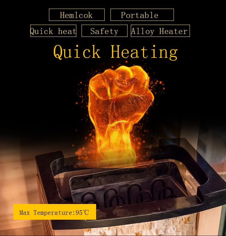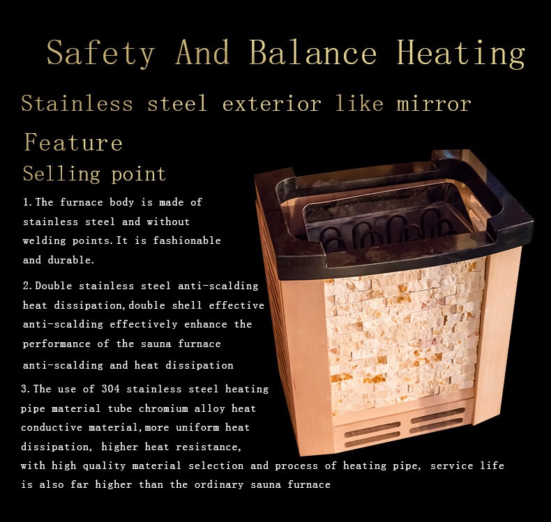 Кроме того, каменка для сауны оснащена устройством защиты от перегрева, которое автоматически отключается, когда температура превышает порог безопасности, гарантируя двойную эффективность нагрева и безопасность пользователя.